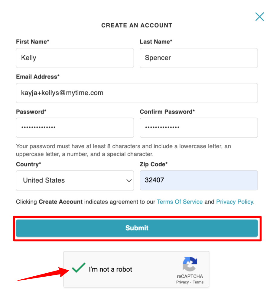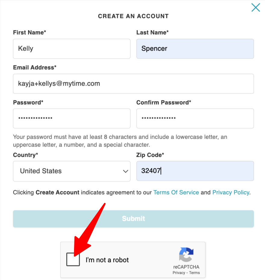 When signing up from the location page, service page, or checkout, the reCAPTCHA will appear and must be completed to finish the signup process. To complete the reCAPTCHA verification during signup: