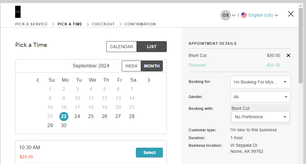 - In calendar view, if only one service is added to the cart, the selected time slot cannot be unselected by clicking on it. However, selecting a new time slot will automatically deselect the previously chosen one.