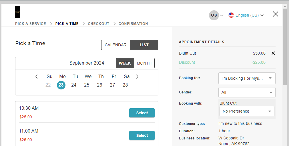 - On the "Pick a Time" page, users can toggle to the list view. This view presents dates in a monthly or weekly view, showing available time slots for all staff members in the business combined if "No Preference" is selected for the "Booking With" field. If a specific staff is selected, then the available time slots for that staff member will be displayed. To select a time, simply click on any available time from the list.