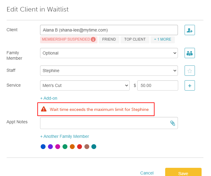If a staff member tries to add a client to the waitlist, the system will display the following error message: “Wait time exceeds the maximum limit for {Employee name}.”