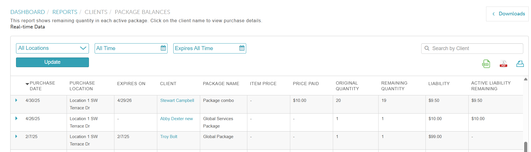 - If a package was purchased for a pet or family member, the report will display the name of the client instead of the pet or family member