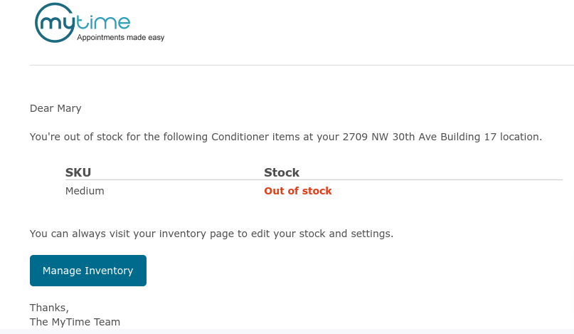 Email - Emails are sent to all authorized staff. Each email contains a SKU Name hyperlink; clicking this redirects you to your MyTime account and opens the inventory record for that specific item.