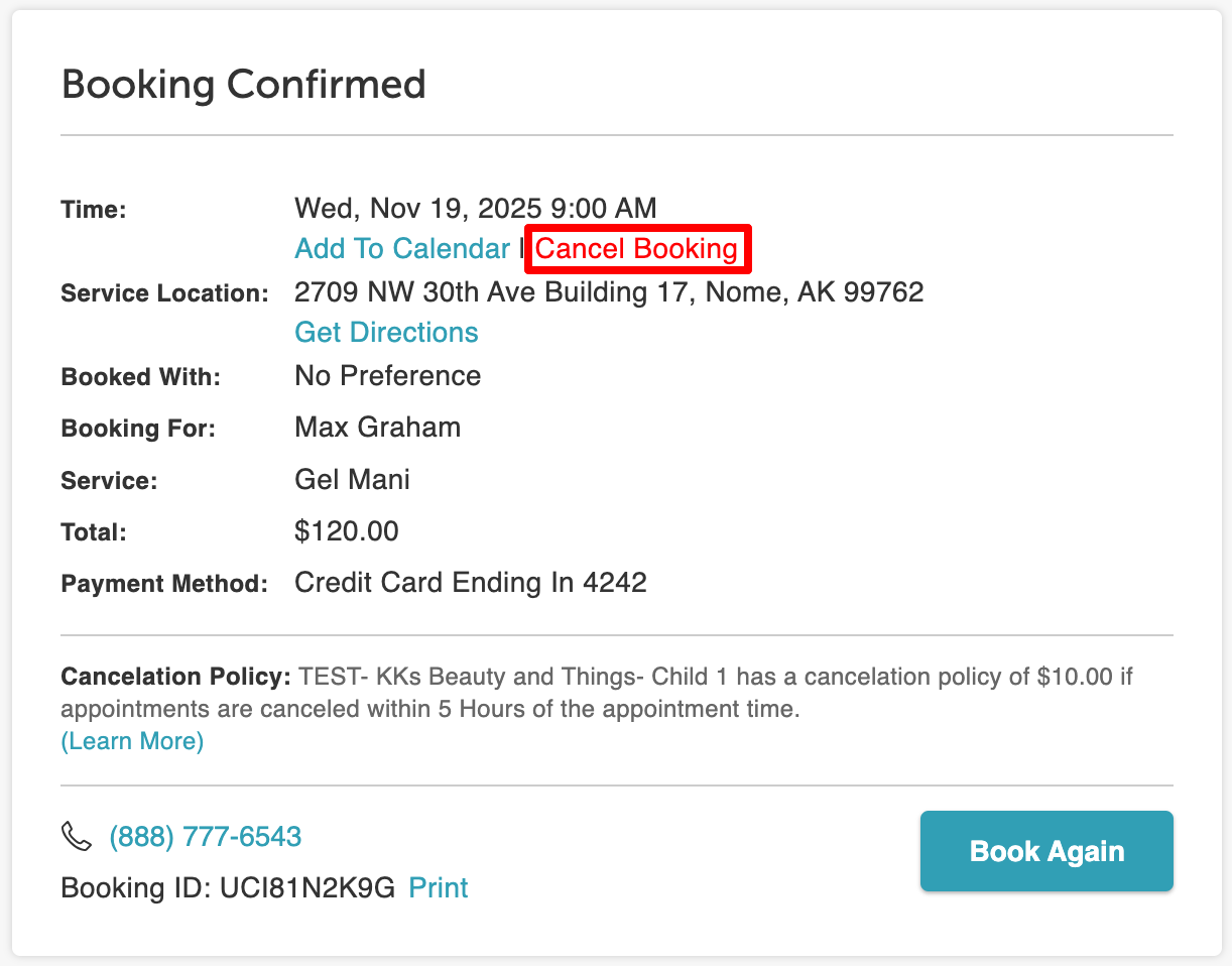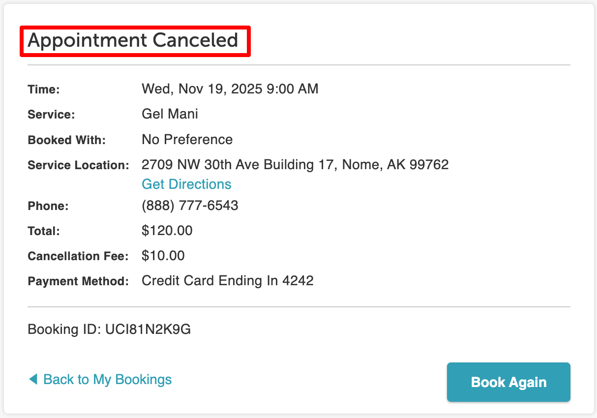 - If a cancellation policy is applied to services, clients can cancel their appointment outside the cancellation window only if the appointment is still in a pending state. Once the appointment is accepted, the cancel link will no longer be visible, preventing clients from canceling online.