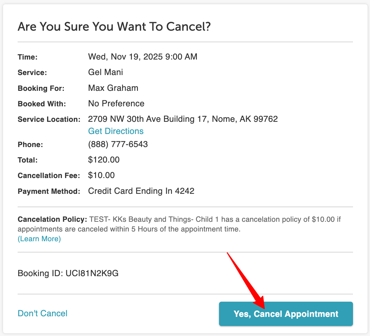 If the client does not agree to the cancellation fee, the appointment cannot be canceled online.
