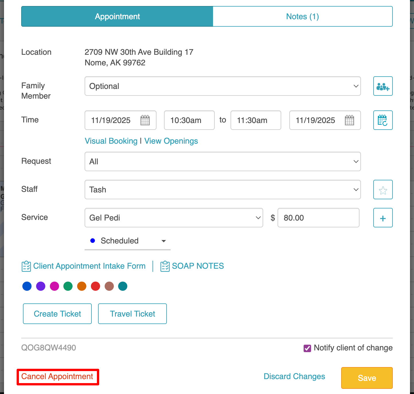 - A ticket for the cancellation fee will appear on the appointment modal.