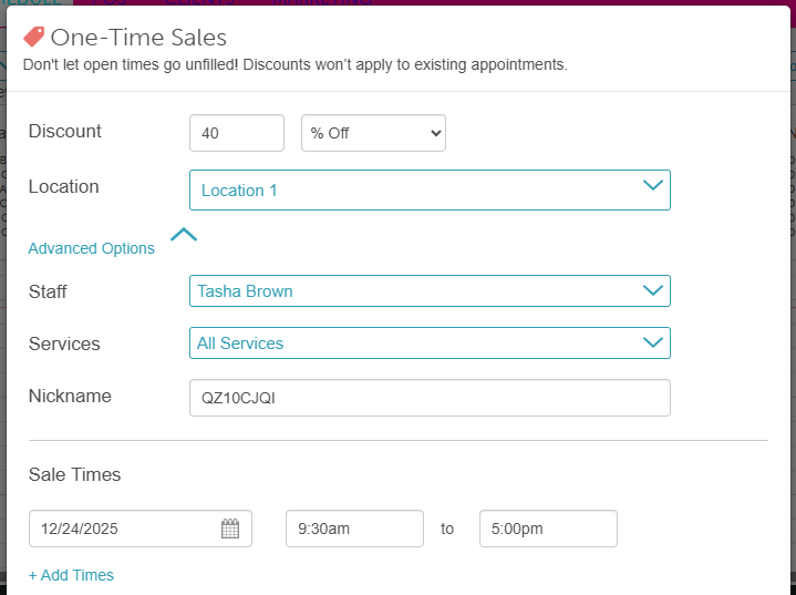 The One-time Sale feature is a great tool to help promote any appointment openings or to simply offer a discount to clients. This can be created from your Schedule page. In this article, we will walk through how to create and share a one-time sale from your schedule.