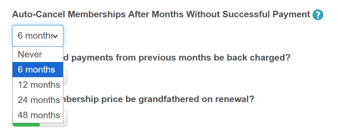 Auto-cancel memberships after months without successful payment![]() | Enable this setting to automatically cancel memberships across your entire company if a successful payment hasn't been recorded within the last selected period of 6, 12, 24, or 48 months. This setting is set to 'Never' by default. |