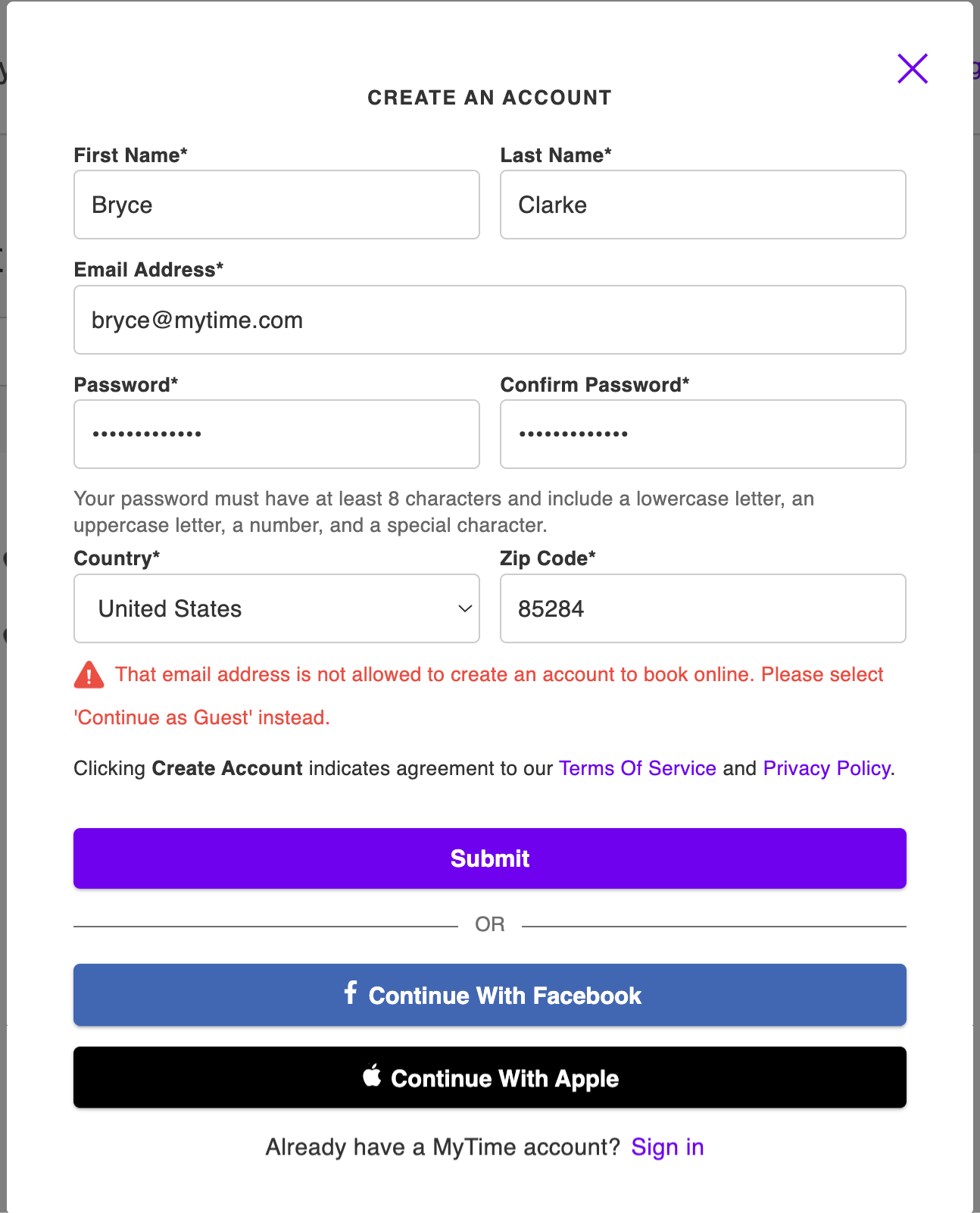 Clients using an approved email domain will be able to create accounts and book online without restriction.