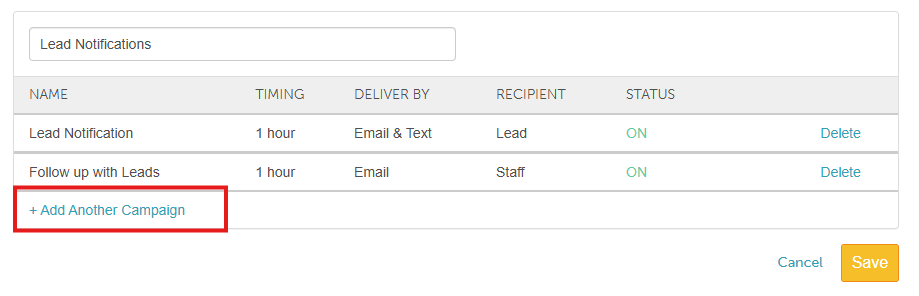 - On the 'Lead Notification' page, click the "+ Add Another Campaign" option
