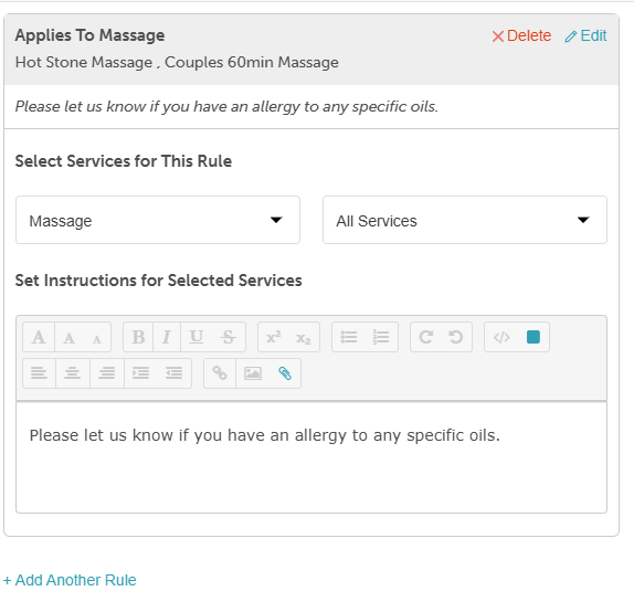 - Common service instructions can be added to apply to all services within a specific category or to selected services within that category. For example, an instruction to wash your hair before visiting the salon can be assigned to the Haircut category, eliminating the need to add the instruction to each Haircut service individually.