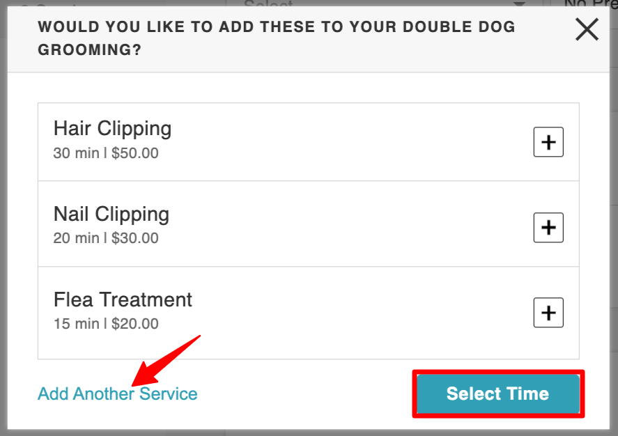 - Clients without a pet on file will first be prompted to select a breed before choosing a service. They will then be asked to enter the pet’s name during the final checkout step to complete the appointment.