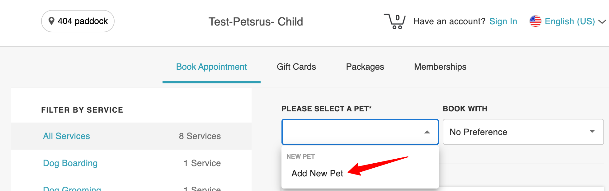 - When booking an appointment for one or multiple pets, selecting Add New Pet on the Services page opens the breed selection modal. If the user closes this modal without selecting a breed, adds a service to the cart, and then attempts to proceed to time selection, the booking will be blocked and the following error message will appear: “Please select a pet or pet breed to continue.”