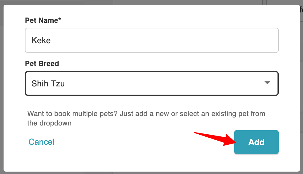 4. Enter pet name and select pet breed from the 'Add New Pet' modal