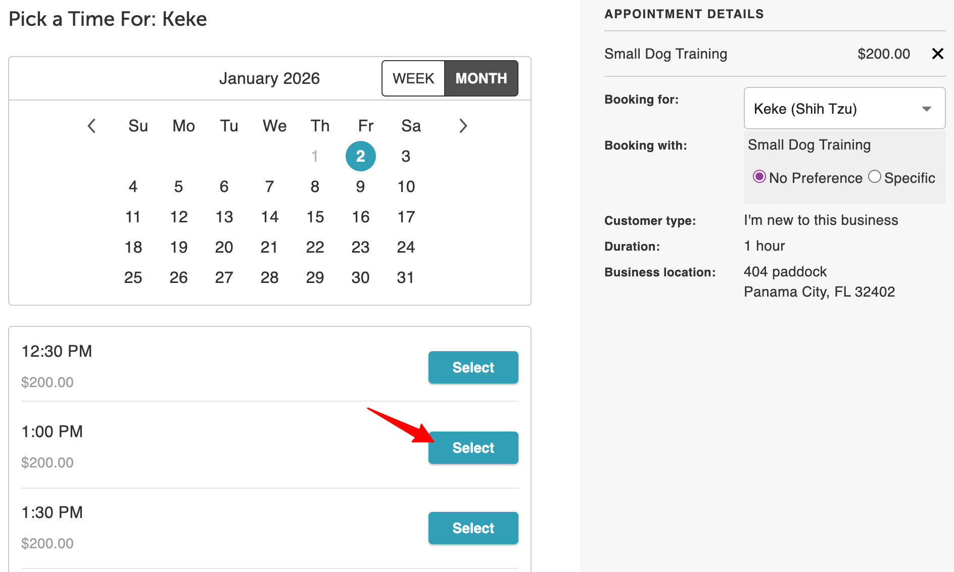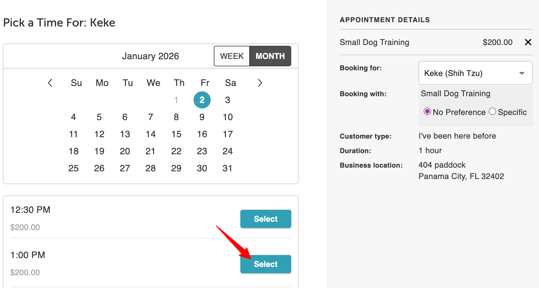Selecting an existing pet redirects the client back to the Pick a Time page to continue booking.