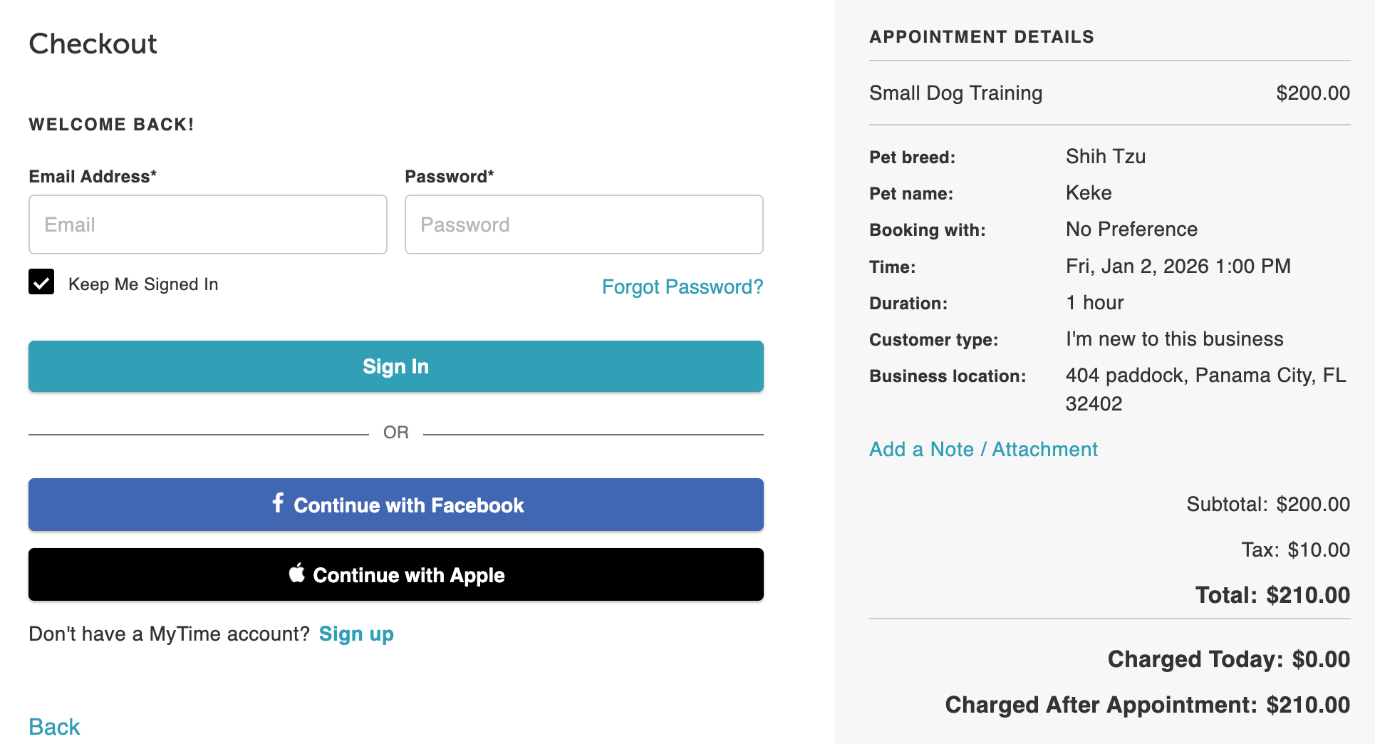 - Clients must sign in using an existing MyTime account, Facebook, or Apple login—or create a new account during checkout.