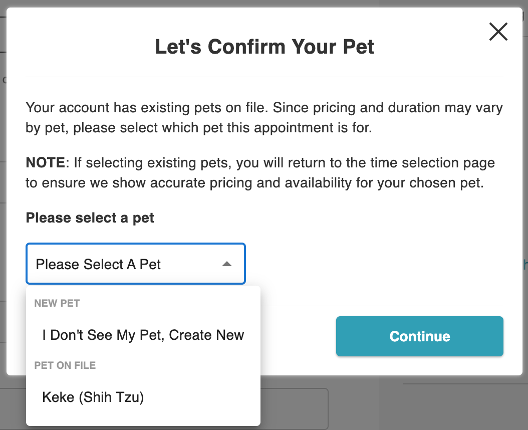 Clients will see a modal window prompting them to either create a new pet or select an existing one.
