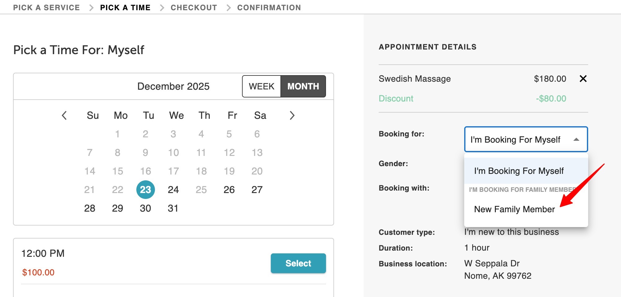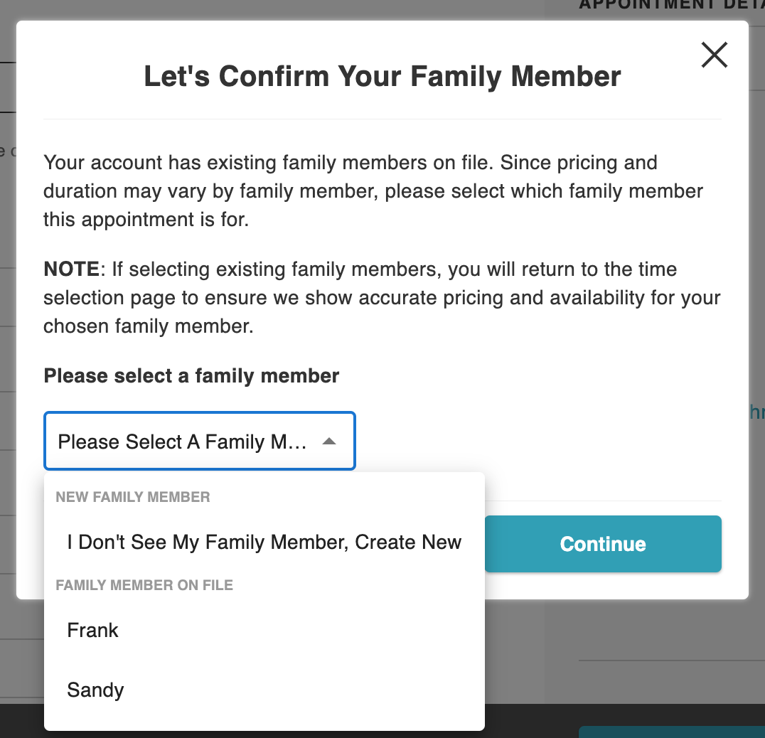 Selecting an existing family member redirects the client back to the Pick a Time page to continue booking.