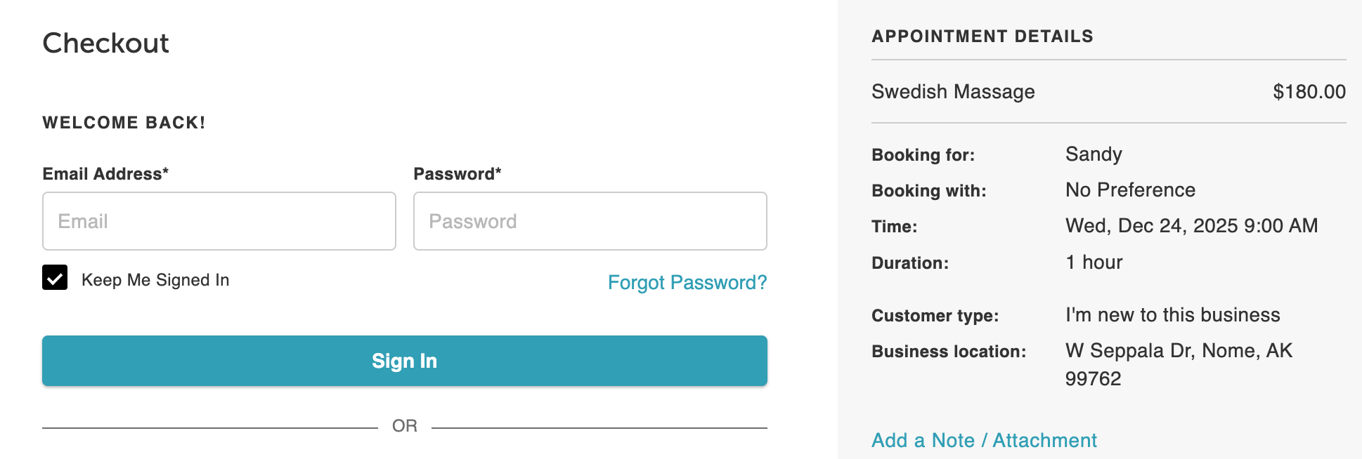 - Clients must sign in using an existing MyTime account, Facebook, or Apple login—or create a new account during checkout.
