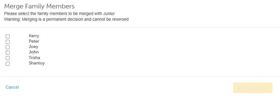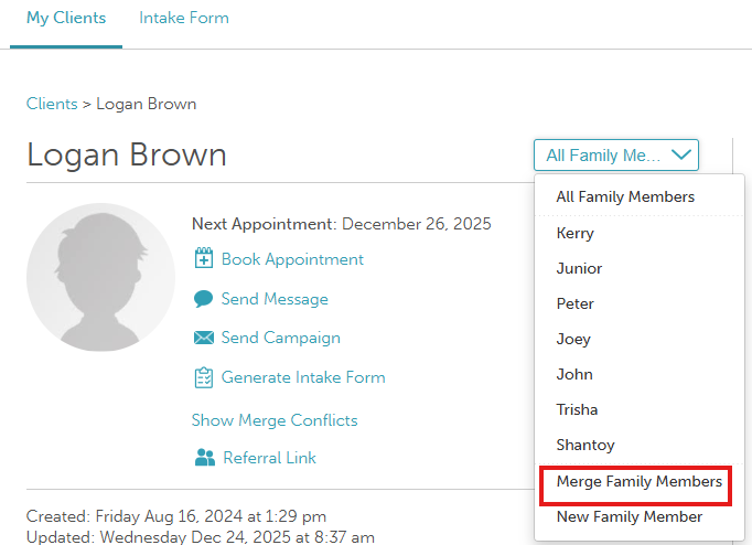 - When merging family members, the membership associated with the family member whose details you choose to keep will remain visible on the client profile.