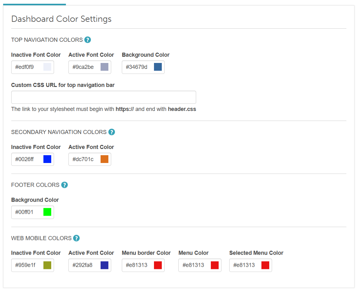 - Dashboard color settings allow you to customize the color scheme across various interface elements, including the top navigation bar on the Dashboard, the secondary navigation bar located directly beneath it, the footer section, and the web mobile view, ensuring a cohesive and branded visual experience across both desktop and mobile platforms.