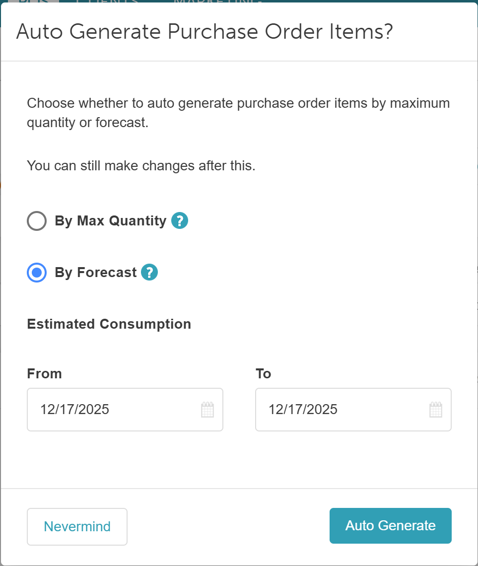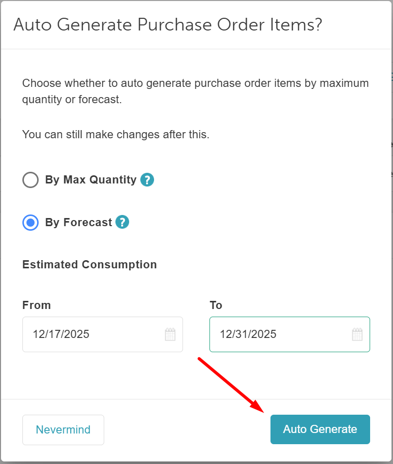 - When auto-generating by forecast, the system also includes products generated by Max. For example, if Max adds 10 SKUs and Forecast adds 2, all 12 SKUs will appear in the PO.