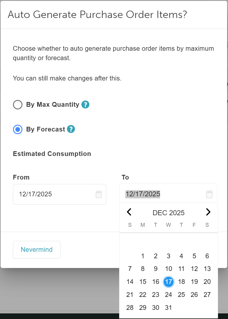- When selecting By Forecast, the system suggests a default start date (current date) and end date. You can adjust these dates, but the start date must be on or before the end date; otherwise, the Auto Generate button will be disabled.