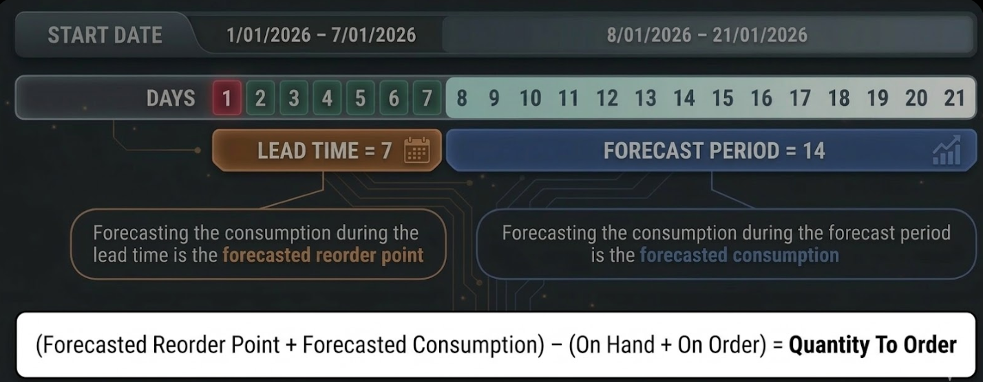 • Forecast Period (Jan 8 – Jan 21): The system calculates the Forecasted Consumption for these 14 days to determine how much stock is needed to last until the next ordering cycle.