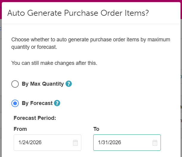 - When auto-generating by forecast, the system also includes products generated by Max. For example, if Max adds 10 SKUs and Forecast adds 2, all 12 SKUs will appear in the PO.