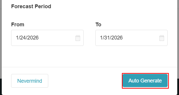 - When selecting By Forecast, the system suggests a default start date (current date) and end date. You can adjust these dates, but the start date must be on or before the end date; otherwise, the Auto Generate button will be disabled.