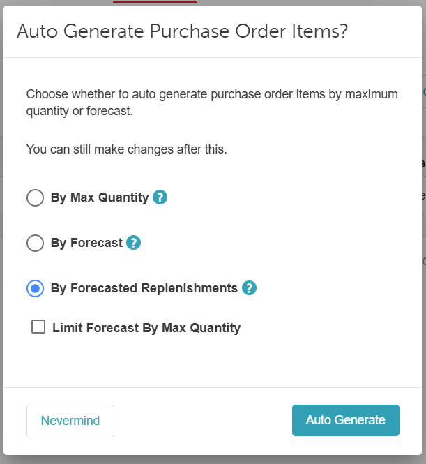 - By default, forecasted quantities are not capped. Enabling the Limit Purchase Order Forecasting by Max setting ensures forecasted amounts never exceed the SKU’s max.