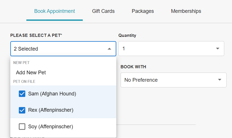 - From the "Please Select a Pet" dropdown menu, choose the pets to include in the booking: