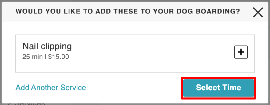 - The "Select Time" button remains disabled until a service is selected for all pets. Hovering over the button will display a specific reminder: "Please select a service for: [Pet Name]."