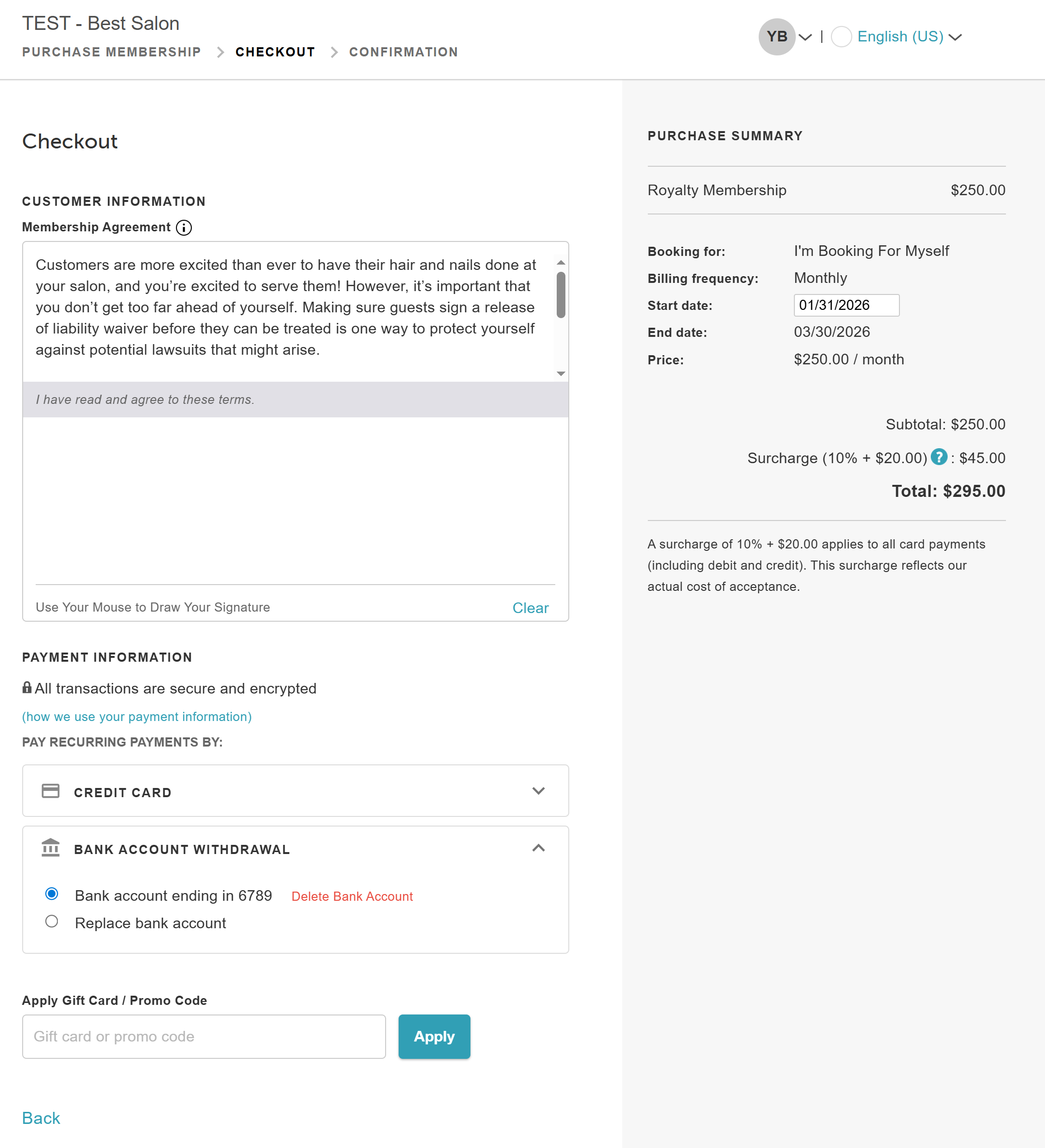- The membership is added to the client’s cart, and they are redirected to the Checkout page.