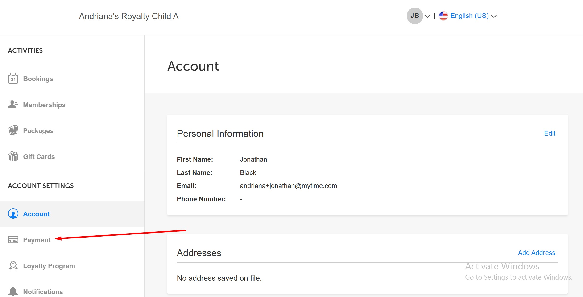 Checking this box in My Account > Payment updates the client profile in the business account.
