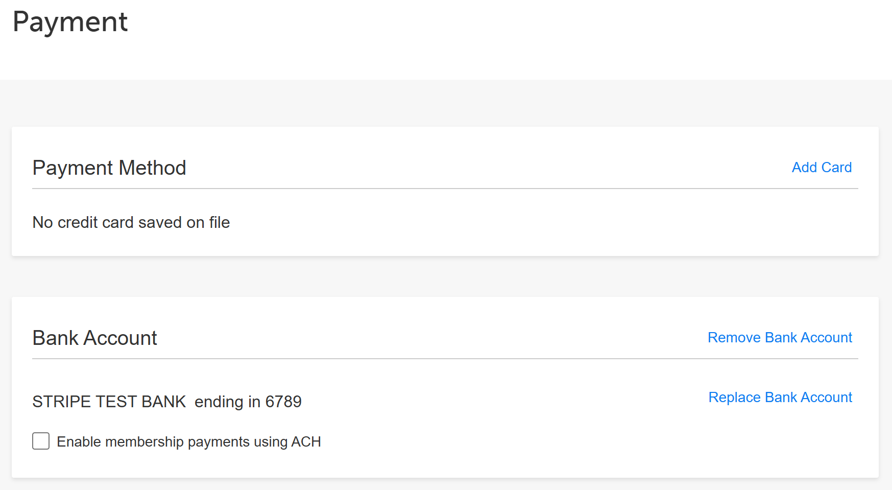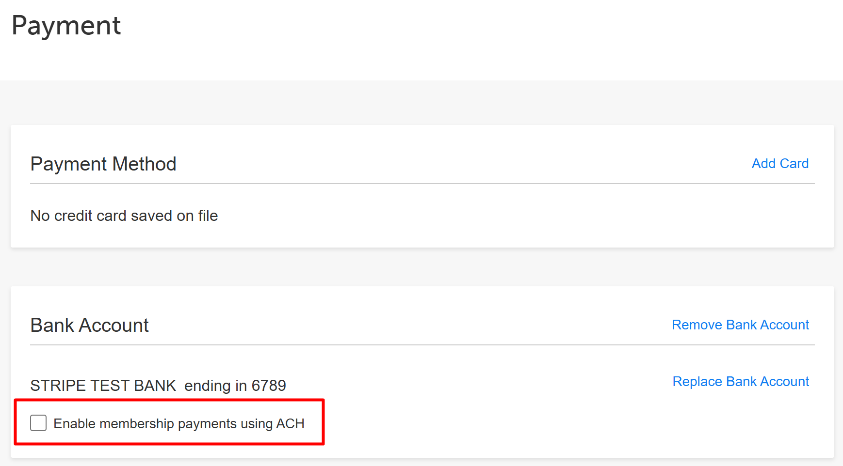 After a bank account is added online, clients will see the option to use this account for membership payments and recurring charges.