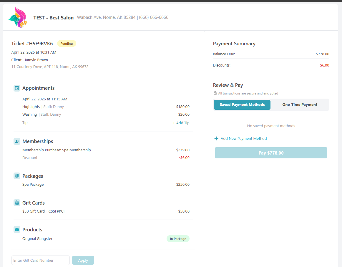 - Saved Card on File: The saved card will appear under Saved Payment Methods. Clients can select it or choose Add New Payment Method to pay with a different card.