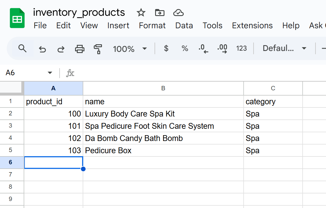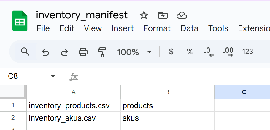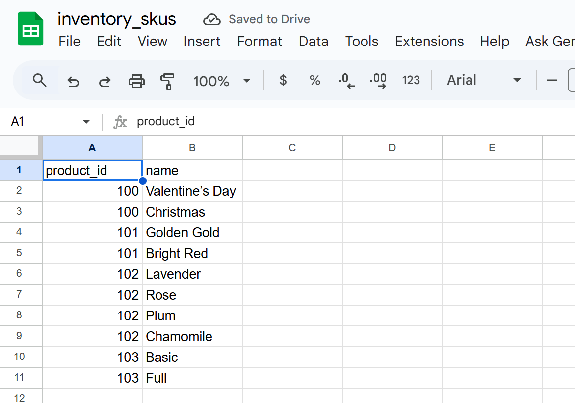 - inventory_skus: This contains the SKUs that should be created for the new products.
