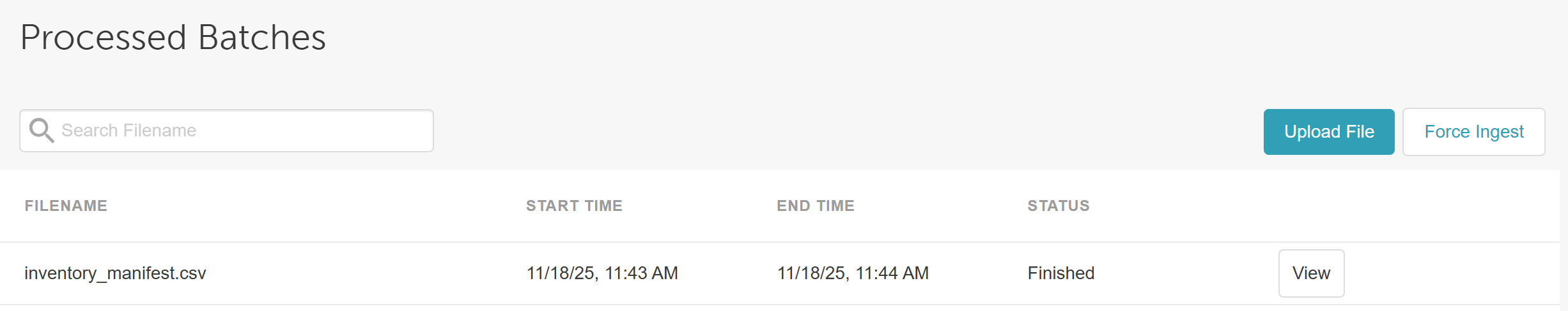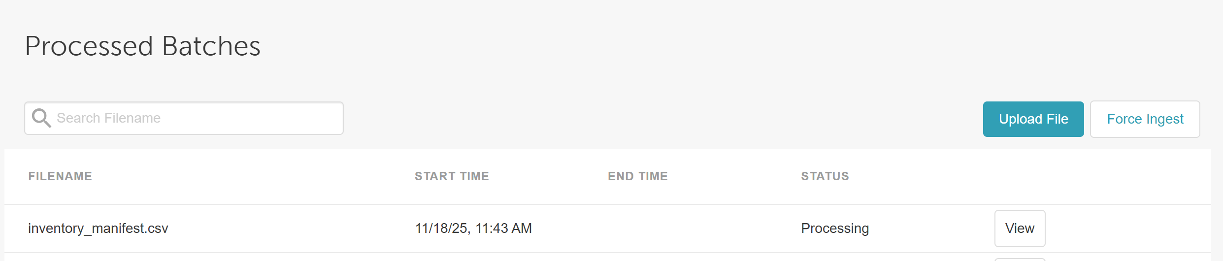 - The page will be directed to the Processed Batches page; the file will appear below with a start date and time, along with the status