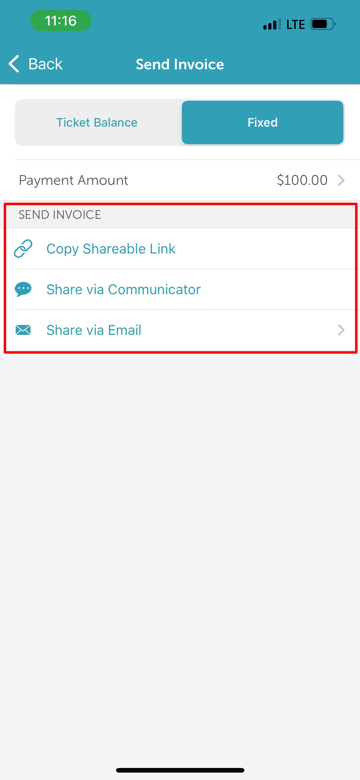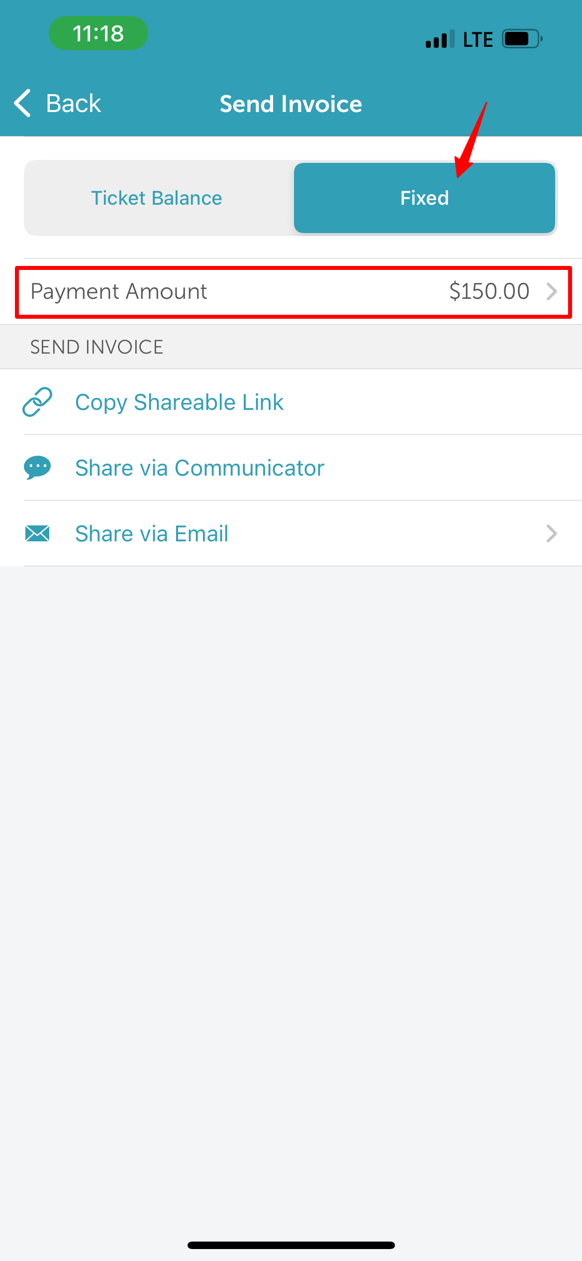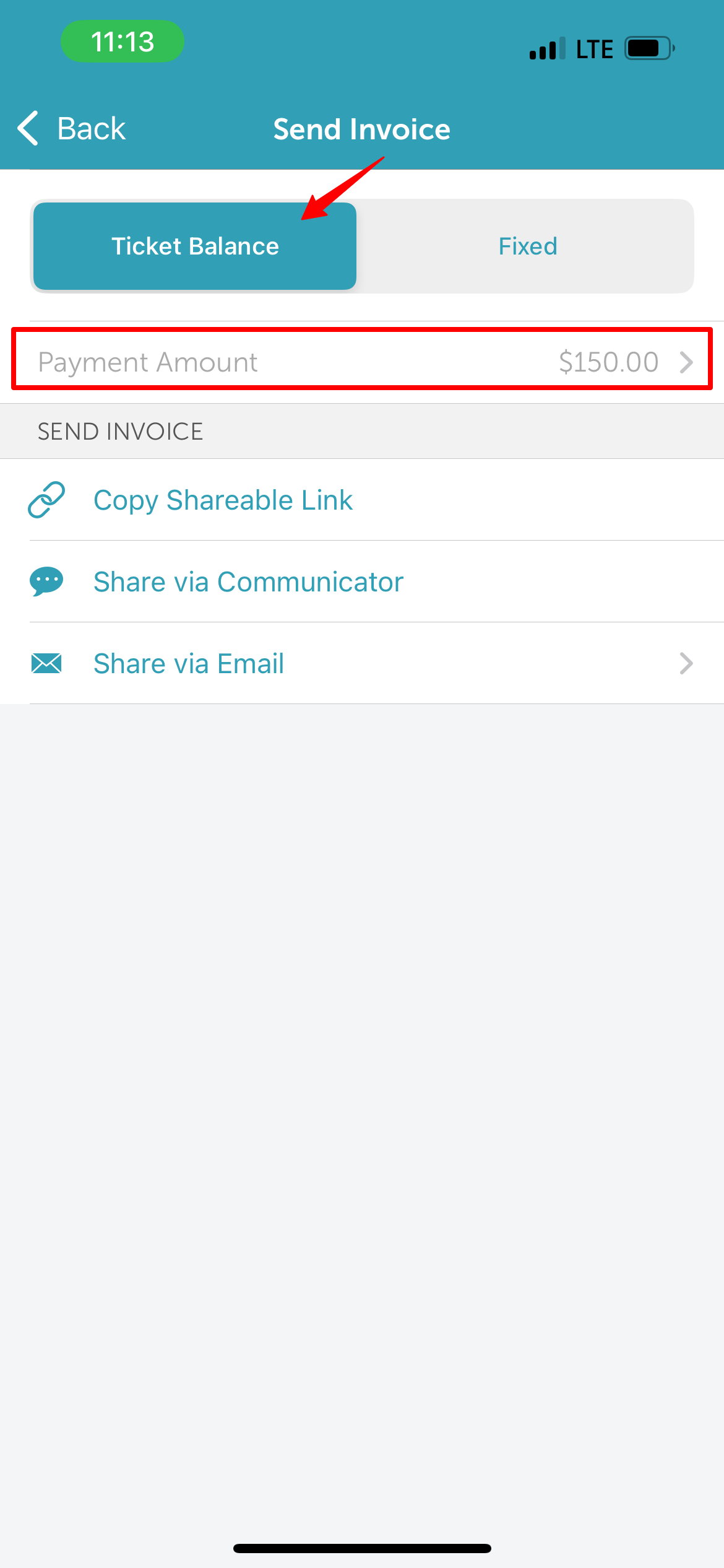 5. On the Send Invoice page, you can choose between 'Ticket Balance' or 'Fixed' payment amount if you need to adjust the amount shown on the invoice.