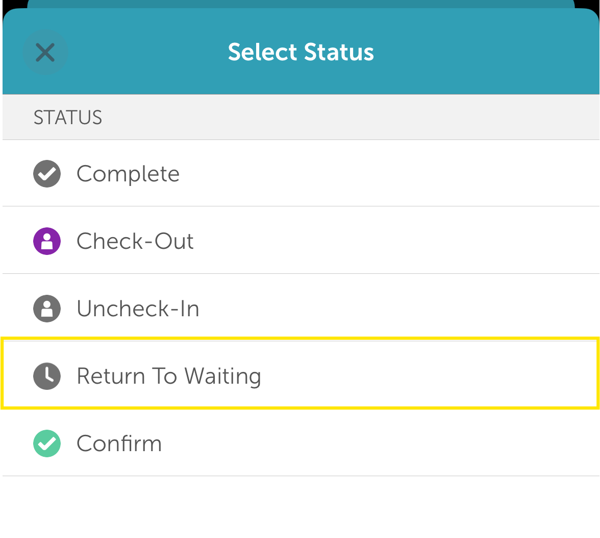 - To return an appointment to the Waitlist, open the appointment modal, click the status bar at the top, and select Return to Waiting.