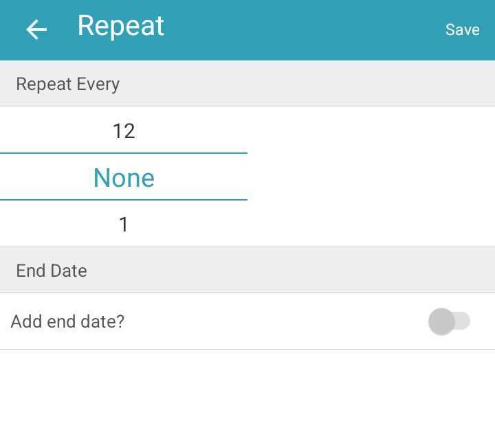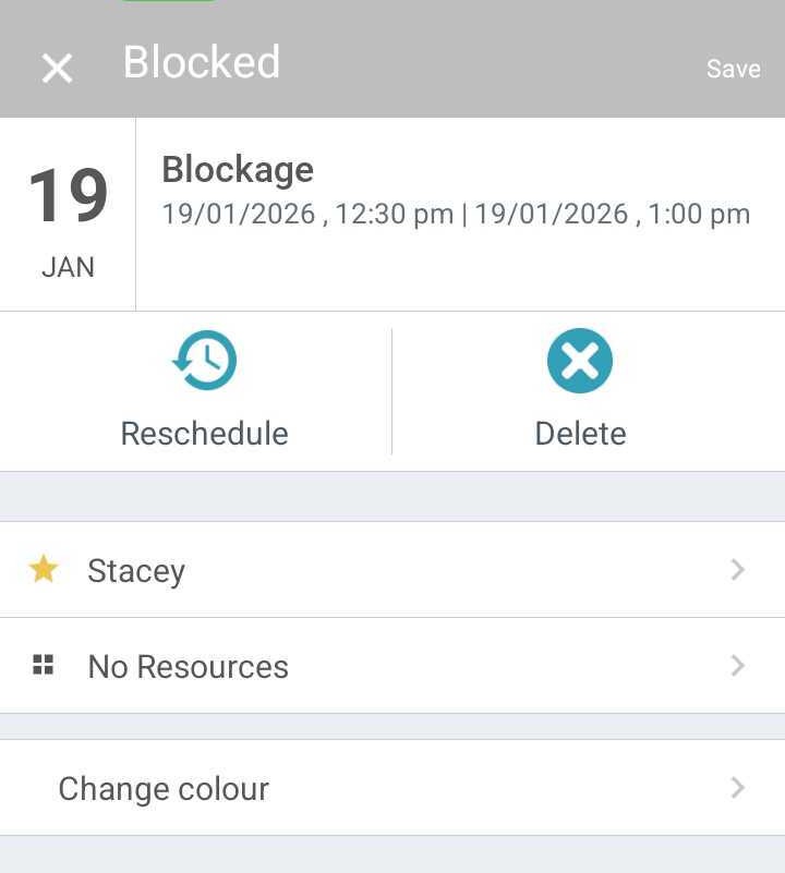 - Repeat: Choose whether the blockage should repeat and, if applicable, select an end date. Tap Save to return to the Reschedule page.