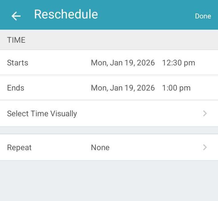 - Time: Tap the time in the Starts or Ends field to open the time selector. You can also tap Select Time Visually to view the schedule for the selected date and choose a new time directly.
