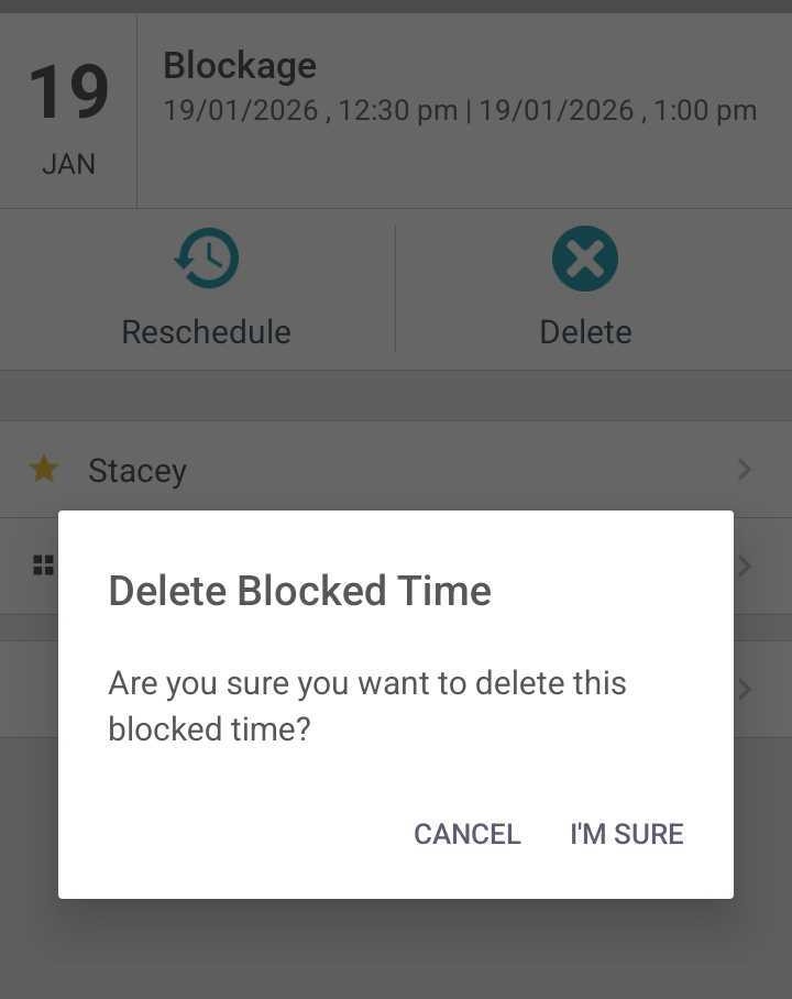 - In the "Delete Blocked Time" modal that appears, tap 'I’m sure' to confirm