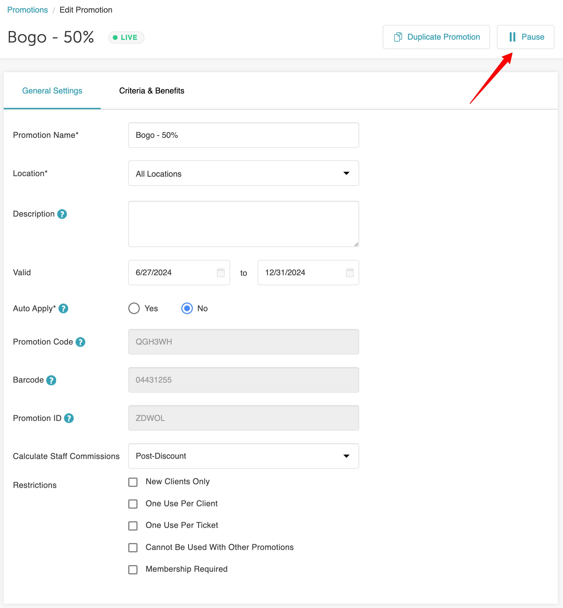 - Click the Pause button next to the Duplicate Promotion button