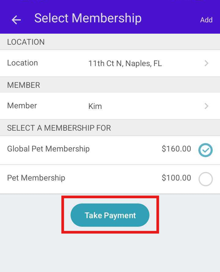 - To add the membership without processing payment immediately, tap Add at the top of the screen