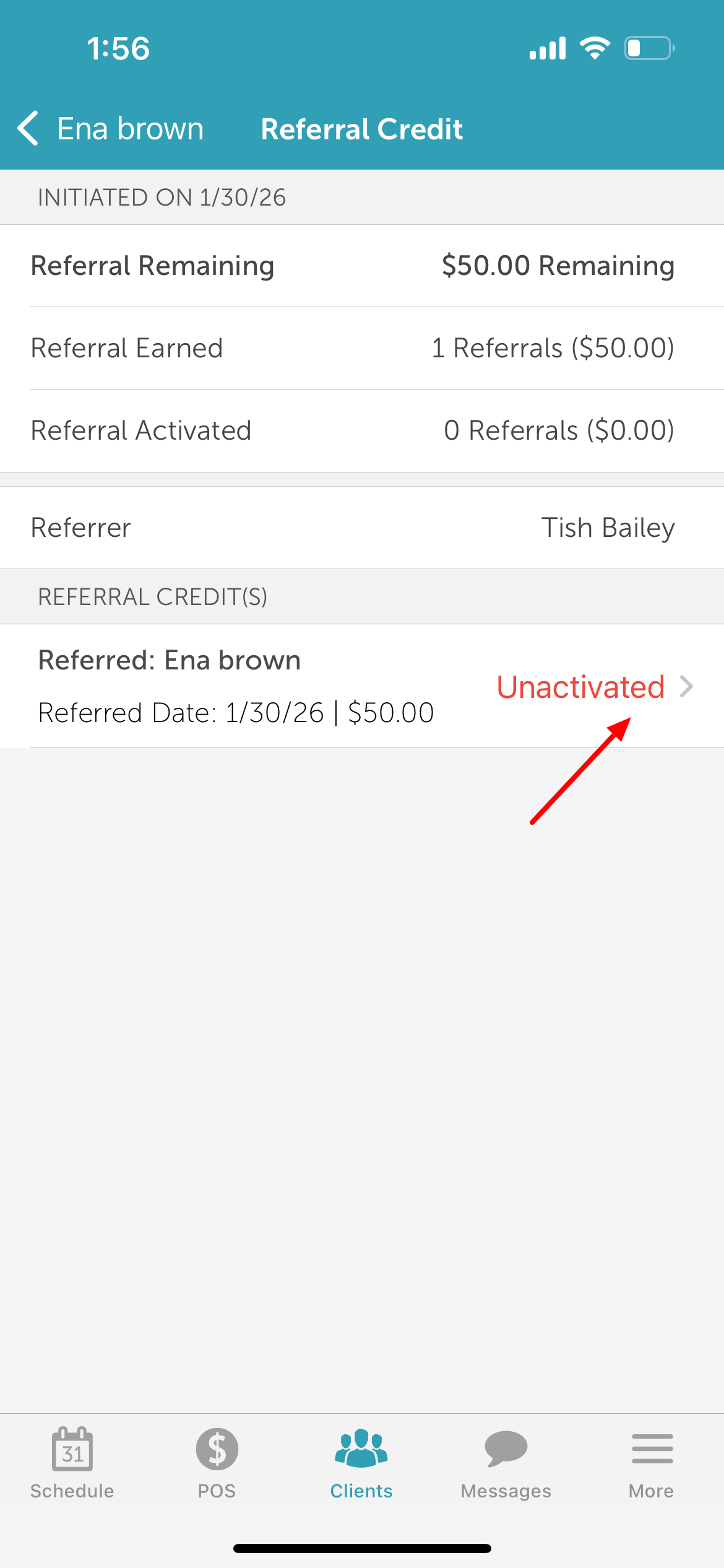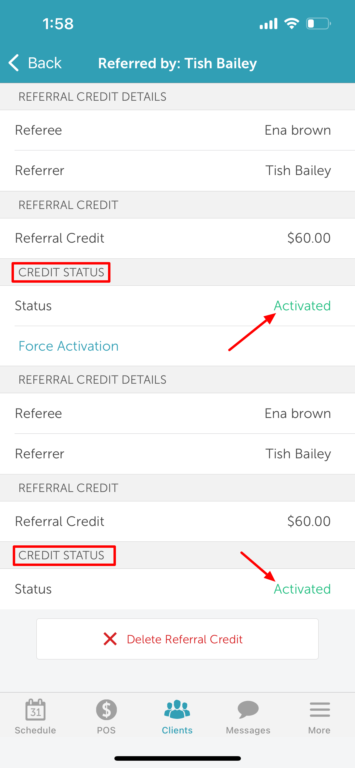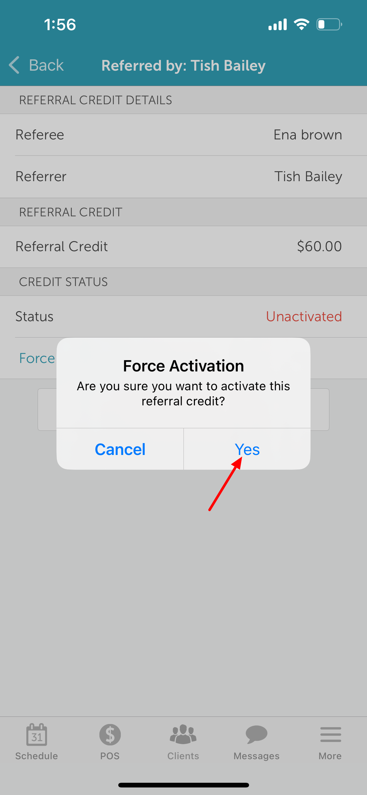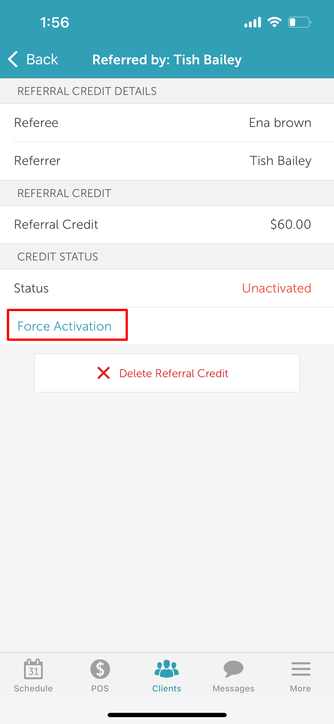 Force activation allows you to manually apply referral credits to a client’s account without requiring the usual triggers (such as a completed purchase). This is helpful when referral credits were not applied automatically due to unmet conditions, but you still want to honor the referral reward. This article walks through how to force activate referral credits using the Scheduler App.