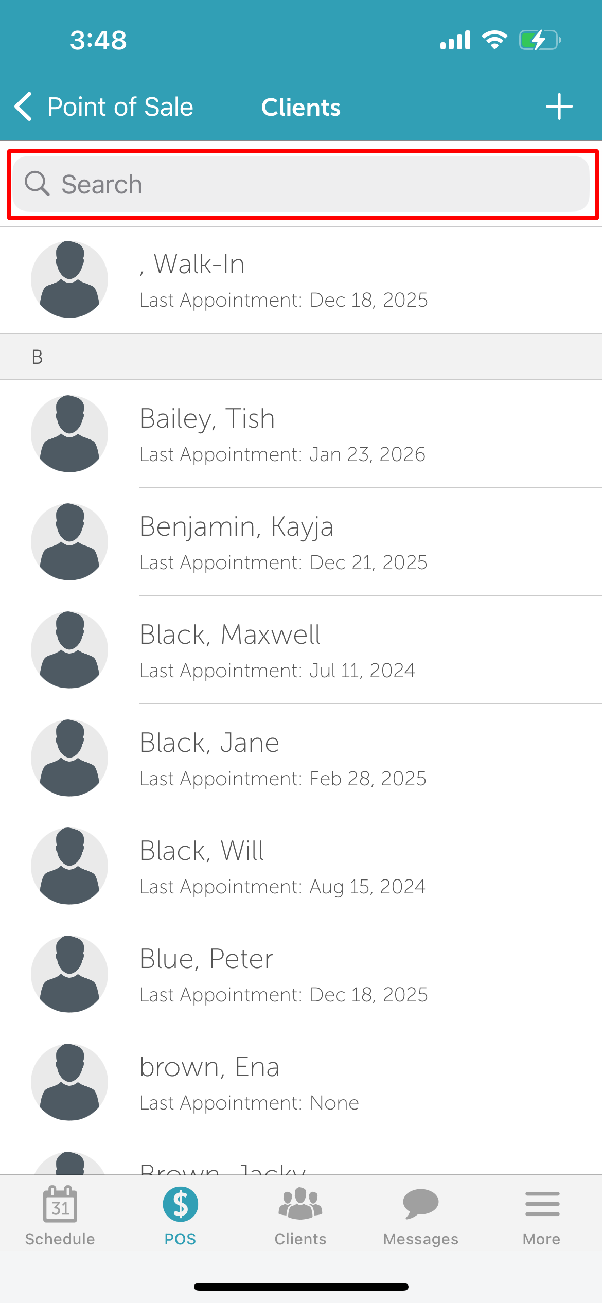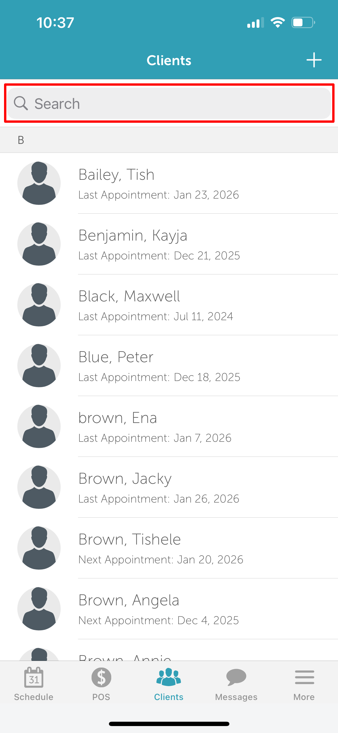 The Client Search feature allows you to quickly locate profiles using names or contact details, streamlining how you manage appointments and purchases. This guide covers how to efficiently search for clients directly within the Scheduler app.