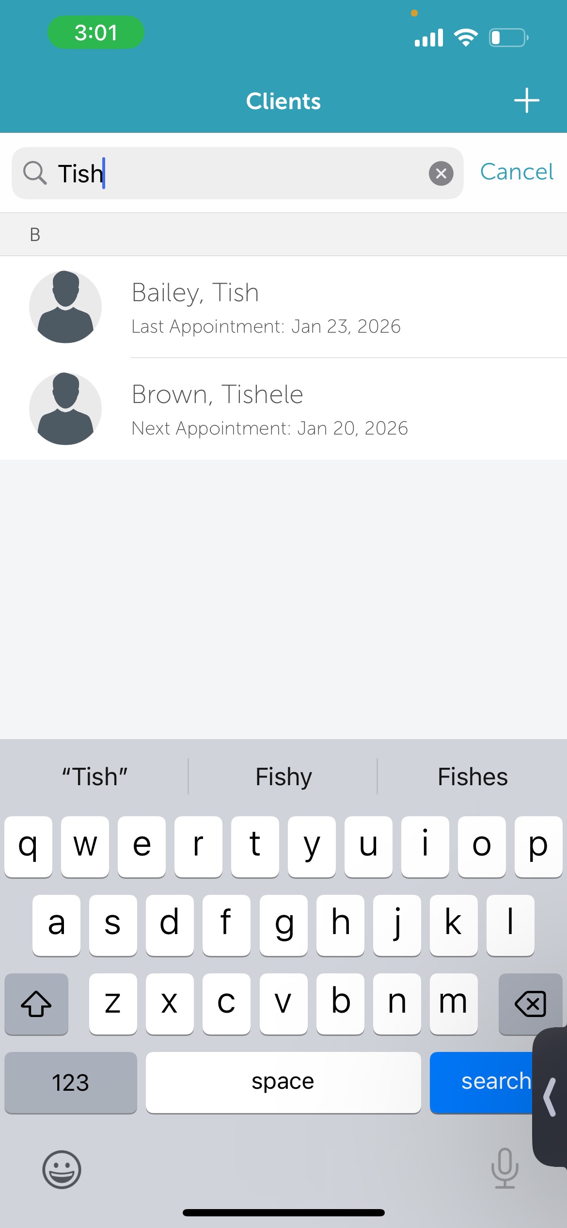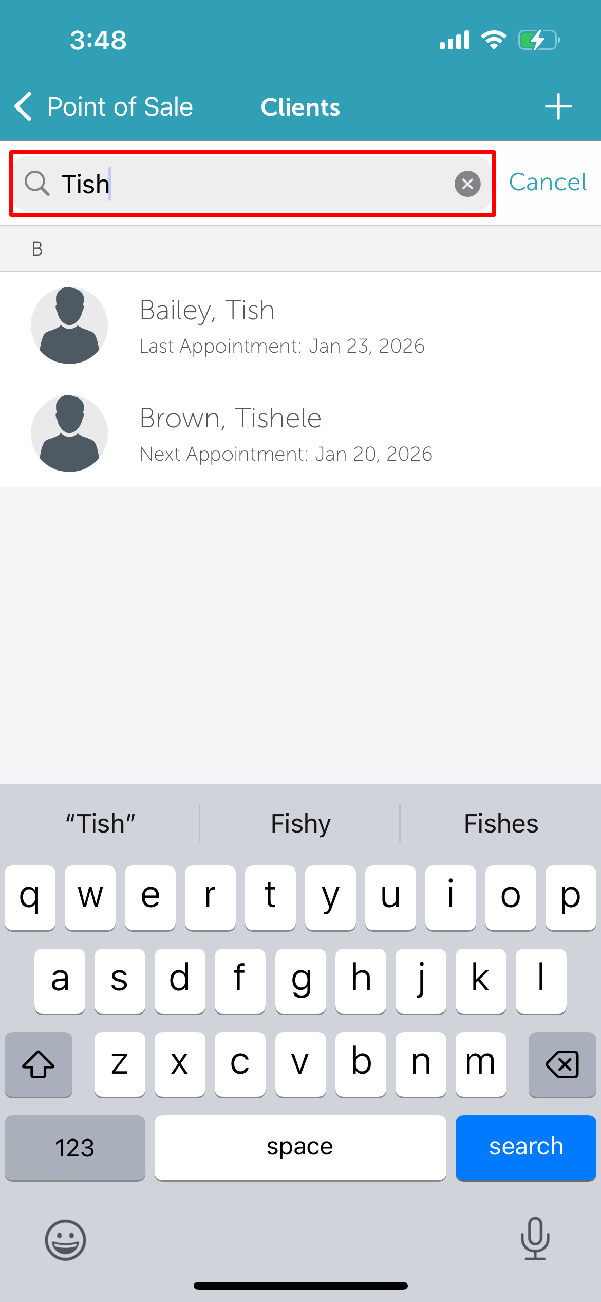 - To save you time, search results in the appointment modal, POS, and Clients tab prioritize clients associated with your current location.