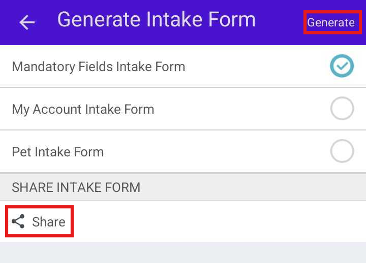 - You can access or distribute the intake form using the Generate or Share buttons: