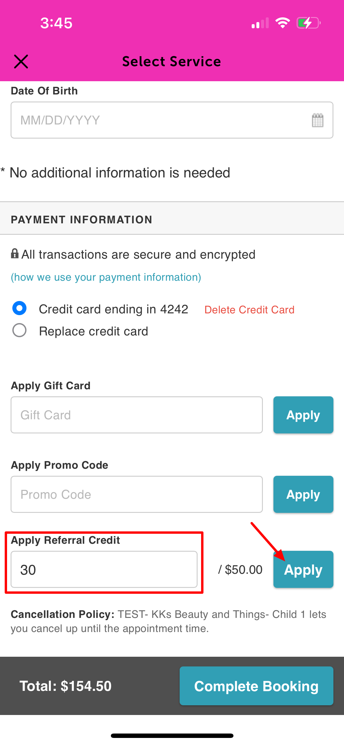9. Scroll to the Apply Referral Credit field. Enter the amount of credit you wish to redeem.